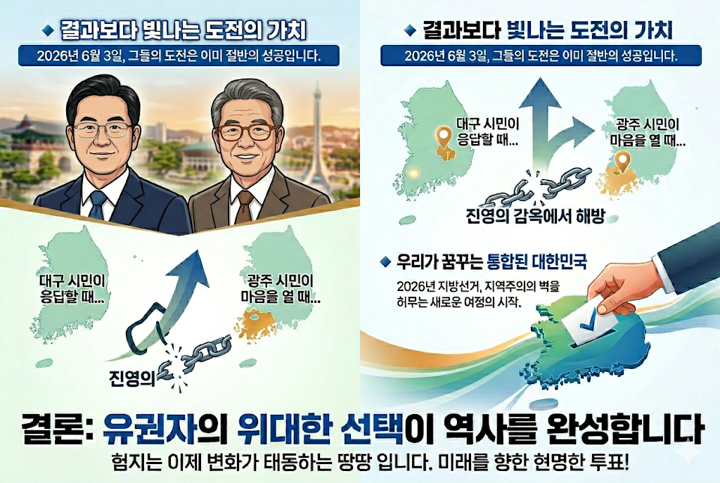 두 인물의 도전은 영호남의 심리적 장벽을 허무는 상징적 행위입니다. 대구에서 민주당 시장이, 광주에서 보수당 시장이 당선되거나 의미 있는 성과를 거두는 것은 대한민국이 진정한 의미의 민주 공화국으로 나아가는 이정표가 됩니다. 이는 극단적 진영 대립으로 피로감을 느끼는 국민들에게 "정치가 희망이 될 수 있다"는 사실을 몸소 보여주는 사건이며, 동서 화합이라는 해묵은 과제를 해결하는 가장 현실적인 방법이기도 합니다.