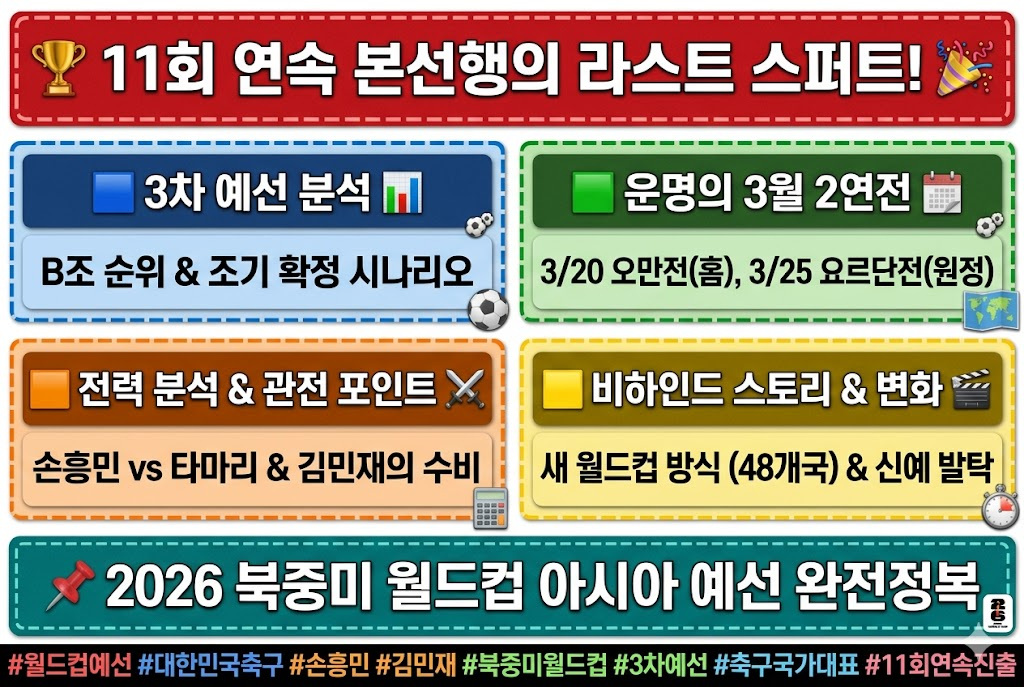 축구 팬 여러분, 심박수가 올라가는 소리가 들리시나요? 2026 FIFA 북중미 월드컵으로 가는 가장 중요한 관문인 아시아 지역 3차 예선이 이제 막바지 종착역을 향해 달려가고 있습니다. 현재 우리 대표팀은 중동의 거센 모래바람 속에서도 탄탄한 조직력과 압도적인 기량을 선보이며 B조 최상단에 이름을 올리고 있습니다. 하지만 방심은 금물입니다! 이번 3월에 펼쳐질 2연전은 단순한 승점을 넘어, 대한민국 축구의 자존심이자 세계 최초 11회 연속 본선 진출이라는 금자탑을 쌓는 결정적인 순간이 될 것입니다. 유럽 무대를 평정하고 돌아온 '캡틴' 손흥민과 철벽 '나폴리 성벽' 김민재, 그리고 세대교체의 주역들이 써 내려갈 승리의 드라마를 지금부터 상세히 파헤쳐 보겠습니다!